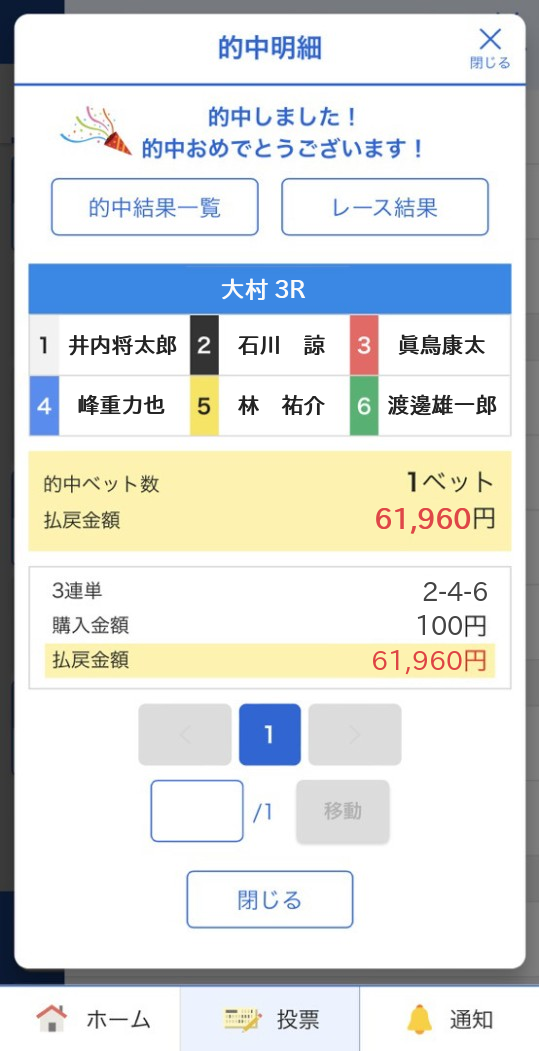 2025年11月5日53,620円 万馬券中! 2025年11月5日53,490円 万舟的中! 2025年11月5日10,170円 万舟的中! 2025年11月5日61,960円 万舟的中! 2025年11月5日10,070円 万車券的中!