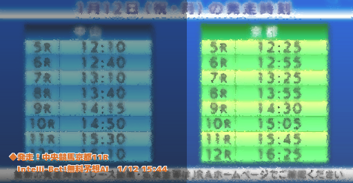 | 2026年1月4日 | 「スポーツニッポン賞京都金杯(GⅢ)」出馬表 馬柱 レース予想・回顧 京都競馬場 11R 15:35分発走 ![]() ![]() ![]() ![]() ![]() ![]() スポーツニッポン賞京都金杯ニュース一覧 |